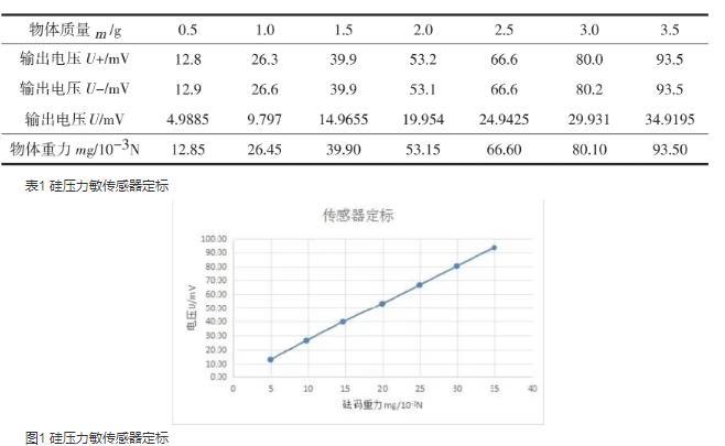 為了減小人為誤差,對(duì)于力敏傳感器的靈敏度的測(cè)量采用先依次增加砝碼片個(gè)數(shù),測(cè)出相應(yīng)電壓用U+表示,再依次減小砝碼片個(gè)數(shù),測(cè)出相應(yīng)電壓用U-表示,然后再將電壓取平均值。測(cè)量數(shù)據(jù)如下,太原地區(qū)的重力加速度為9.7970 m/s2。由圖1得傳感器的靈敏度為B=2.6792 V/N,線性相關(guān)系數(shù)R2=0.9999。